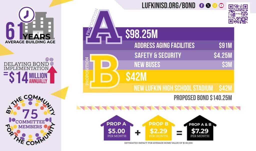 Healthy school districts also plan ahead. It is common for districts to pursue bonds every four to six years to stay ahead of growth and maintenance. Lufkin ISD has not had a bond since 2018. While it may feel sooner, COVID slowed progress, and major projects like Lufkin Middle School have only recently been completed.