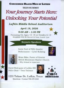 Helping Youth Find Their Path: Teen Summit Set for April 18 Local students will have the opportunity to learn, grow, and be inspired at an upcoming Teen Summit hosted by the Concerned Black Men of Lufkin. The event, “Your Journey…